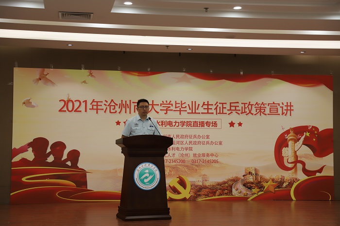 根据《关于组织大学毕业生征兵政策宣传网络直播活动的通知》安排,6月10日晚上7:30我校联合沧州市军分区在我校报告厅举办大学毕业生政策宣讲,由沧州市军分区动员处参谋孙永辉担任主讲。我校征兵工作站、各学院征兵工...