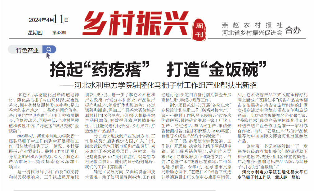 4月11日,《河北日报农村版·燕赵农村报》第5版以《拾起“药疙瘩” 打造“金饭碗”——WB.COM驻隆化马栅子村工作组产业帮扶出新招》为题,对我校驻村工作组产业帮扶事迹进行专题报道。《河北日报农村版·燕赵农村报》原名《河北农民报》,于2021年6月更名,系河北日报报业集团旗下河北省委省政府指导全省农业农村工作的新闻舆论传媒机构,是党报党刊,创刊于1964年,前身《河北农民报》由毛泽东主席亲笔题写报名,是河北省内唯一面向农村发行的涉农类报刊。...
