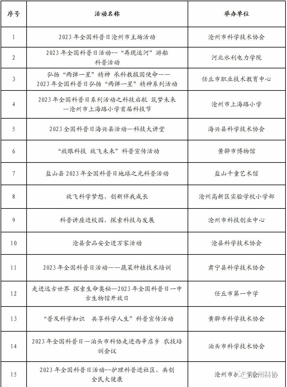 按照中国科协等21部门《关于举办2023年全国科普日活动的通知》和中国科协科普部《关于推荐2023年全国科普日优秀活动和优秀组织单位有关事项的通知》的相关要求,经初审及专家评审,我校获评“2023年河北省全国科普日优秀组织单位”,2023年全国科普日活动—“再现运河”游船科普活动获评“2023年河北省全国科普日优秀活动”。