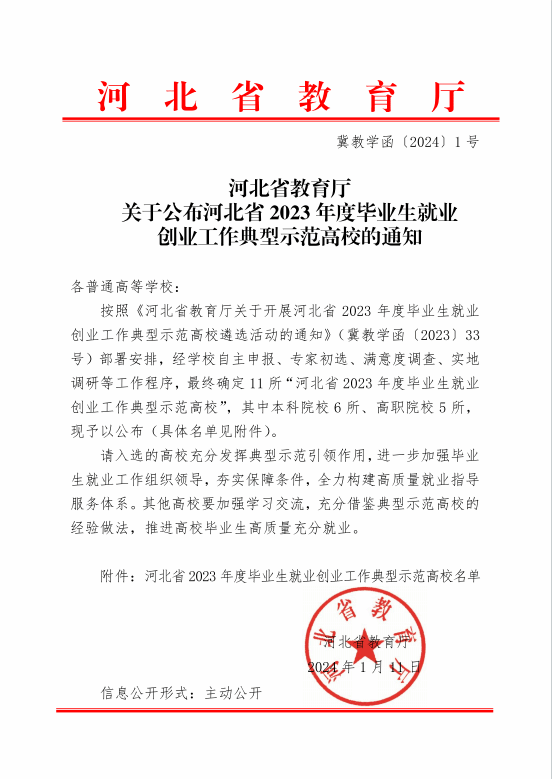 1月11日,河北省教育厅下发《关于公布河北省2023年度毕业生就业创业工作典型示范高校的通知》(冀教学函〔2024〕1号),我校成功获评河北省2023年度毕业生就业创业工作典型示范高校。