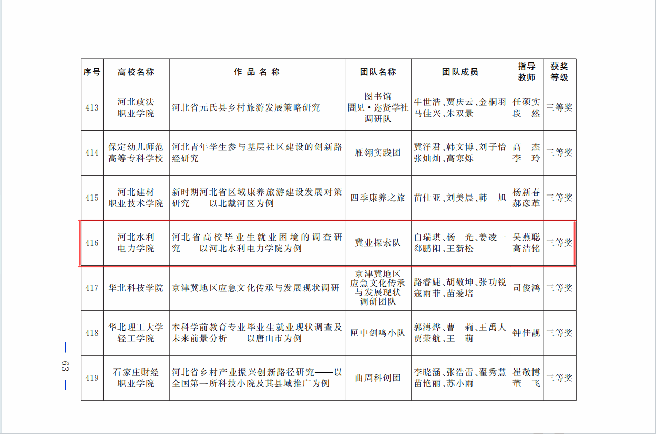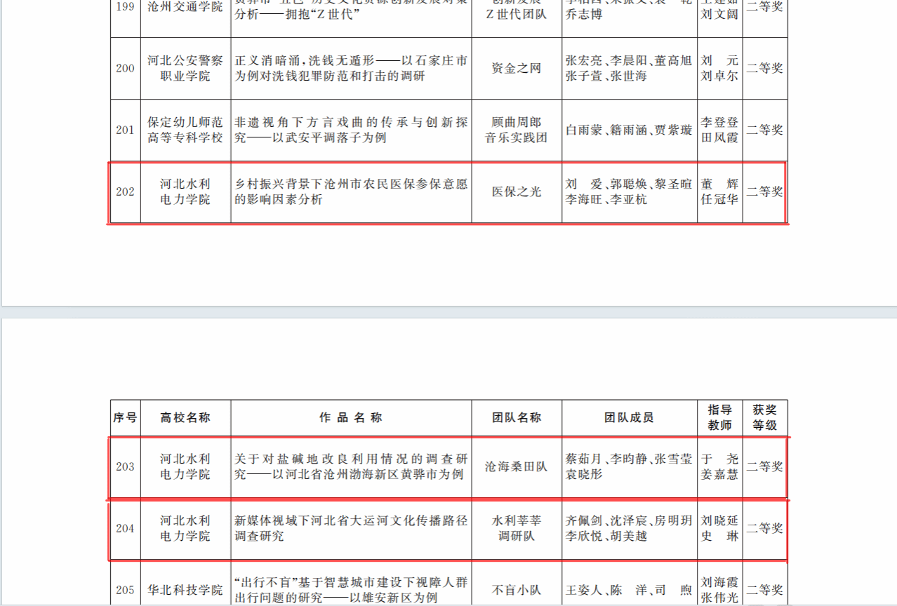 近日,共青团河北省委、河北省社会科学院以及河北省学生联合会公布了关于2023-2024年度河北省大学生“调研河北”社会调查活动情况,我校沧海桑田调研队《关于对盐碱地改良利用情况的调查研究——以河北省沧州渤海新区黄骅市为例》、水利莘莘调研队《新媒体视域下河北省大运河文化传播路径调查研究》、医保之光调研队《乡村振兴背景下沧州市农民医保参保意愿的影响因素分析》分别在活动中荣获二等奖,冀业探索调研队《河北省高校毕业生就业困境的调查研究——以WB.COM为例》荣获三等奖。调研活动自2024年1月开展以来,校团委精心谋划部署,广泛宣传动员,吸引了本校32名教师、100多名同学参加调研,共计报送27个参赛项目,最终4个项目顺利结项并获奖。