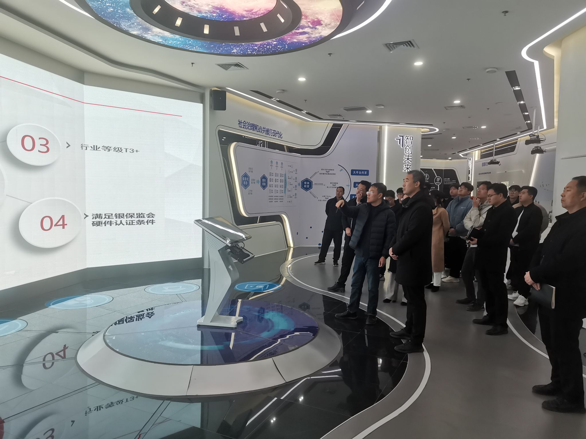在沧州云智大数据产业园有限公司副总经理付红星的引领下,我校师生首先参观了创新展示中心,了解数据中心及微模块机房相关情况,亲身体验了大数据在智慧城市、智能工地等领域的实际应用。