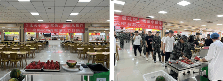 为了庆祝教师节,一食堂99-10日中午特意为水院学子准备了可口的西瓜,为正在军训的新生送来清凉!