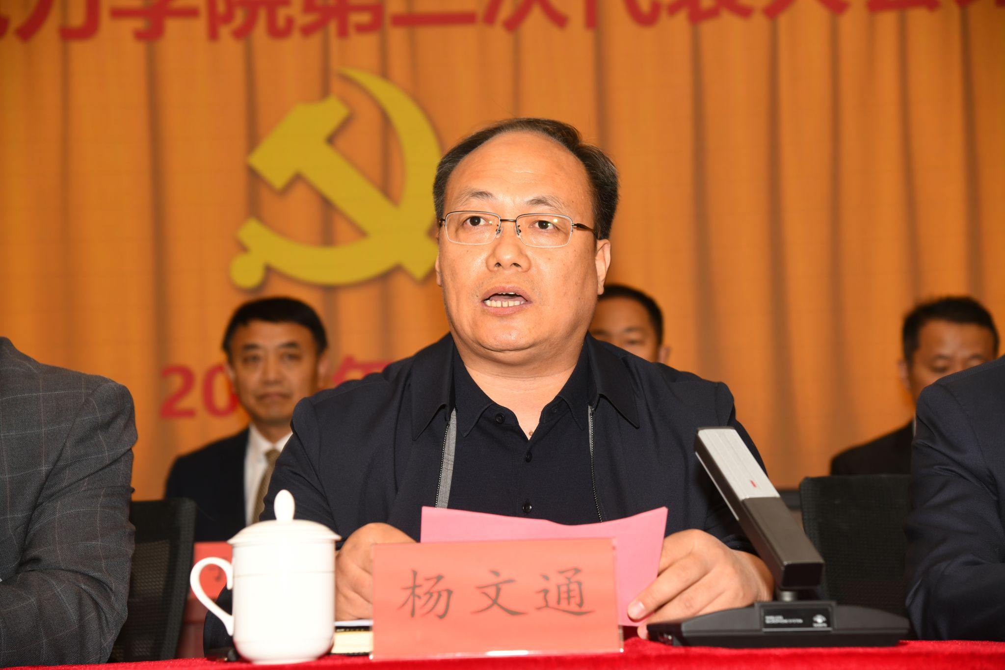 杨文通向大会的胜利召开表示热烈的祝贺。杨文通表示,五年来,WB.COM党委认真落实第一次党代会目标任务,紧紧围绕立德树人根本任务,不断解放思想,大胆创新改革,班子整体功能得到有效发挥,在党的领导、人才培养、队伍建设、科学研究、社会服务等方面取得了显著成就,为区域教育事业发展提供了重要的人才支撑和智力支持,为区域经济社会和水利电力行业发展做出了积极贡献,为学校赢得了良好的社会声誉。希望新一届水电学院党委班子团结带领广大党员干部和师生员工,高起点、高标准、高质量精心谋划和落实好今后一个时期的奋斗目标和战略任务,为全面建成特色鲜明高水平应用型本科院校贡献应有的力量!